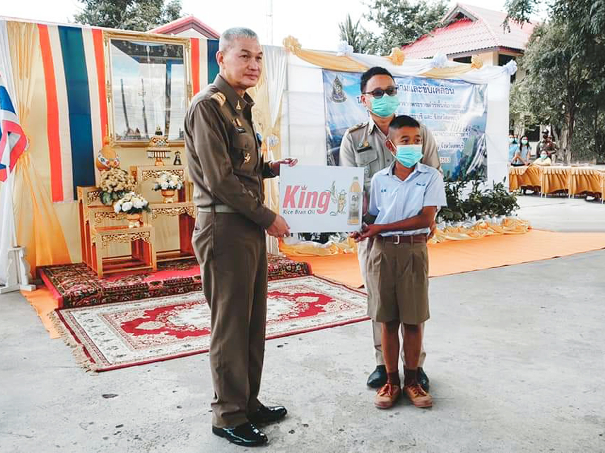กลุ่มน้ำมันรำข้าวคิง สนับสนุนน้ำมันรำข้าวคิงเกรดมาตรฐาน ขนาด 1 ลิตร เพื่อใช้ประกอบอาหารกลางวันให้แก่นักเรียน และบุคลากรของโรงเรียนในเขตพื้นที่โครงการอันเนื่องมาจากพระราชดำริ โครงการก่อสร้างอ่างวังตะโกอันเนื่องมาจากพระราชดำริ ต.โคกแสมสาร อ.โคกเจริญ จ.ลพบุรี ได้แก่ โรงเรียนบ้านโคกแสมสาร โรงเรียนบ้านสระเพลง และโรงเรียนบ้านลำโป่งเพชร จำนวนรวม 30 ลัง โดย