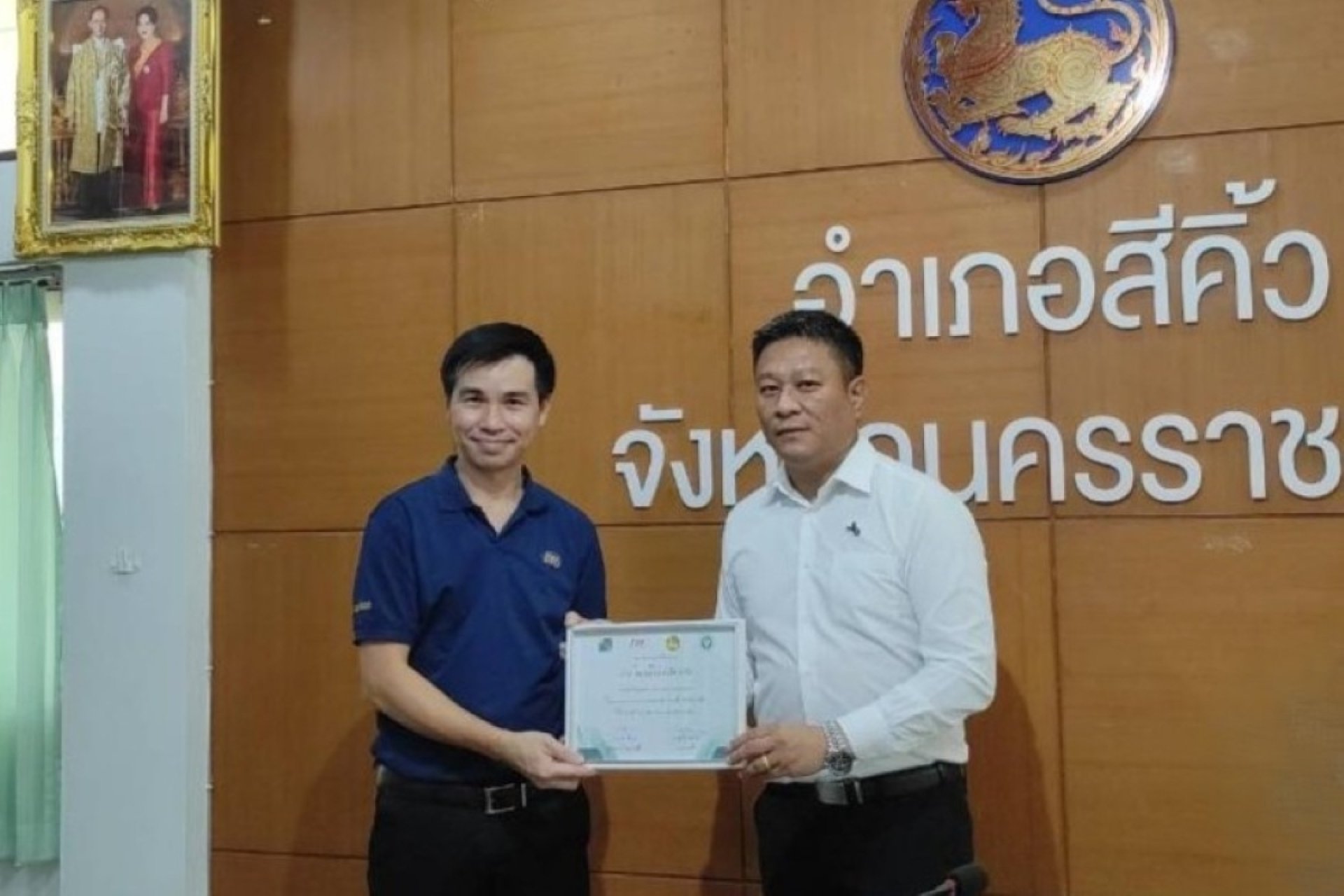 2 เม.ย.ที่ผ่านมา คุณเจริญศักดา เขตสิทธิ์ (ซ้าย) รก.ผจก.แผนกสำนักงาน บจก.ไทยร่วมใจน้ำมันพืช (โคราช) เข้ารับเกียรติบัตรในโครงการสถานประกอบการต้นแบบสุขภาพจิตดี อ.สีคิ้ว จ.นครราชสีมา จาก คุณสรวิศ เหล่านิล (ขวา) นายอำเภอสีคิ้ว ณ ห้องประชุม อ.สีคิ้ว จ.นครราชสีมา